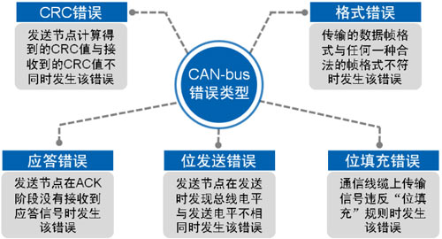 盡管CAN通訊的可靠性很高,但是依然可能出現(xiàn)錯(cuò)誤。錯(cuò)誤類型有一下五種。