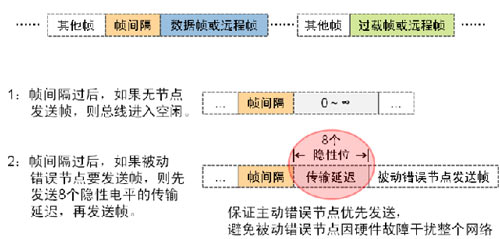 幀間隔用于將數(shù)據(jù)幀或遠(yuǎn)程幀和他們之間的幀分離開, 但過載幀和錯(cuò)誤幀前門不會(huì)插入幀間隔。