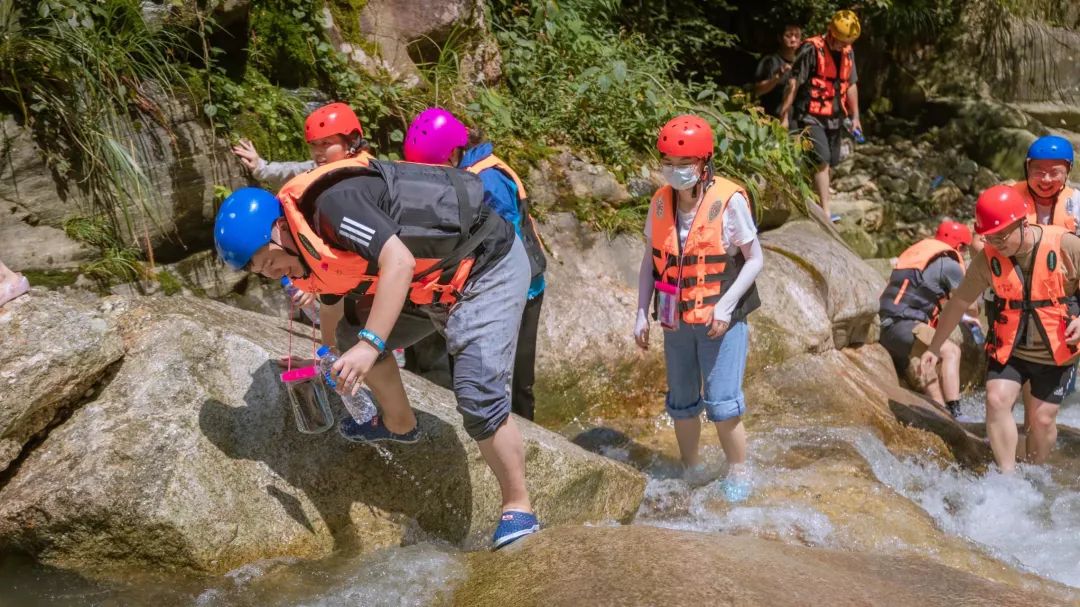 逆流而上的過程考驗(yàn)著健科小伙伴們的體力和耐力,但沿途也一樣處處充滿著驚喜。水流聲、蟲鳴鳥叫聲、每個(gè)人的歡聲笑語,在山林中交織在一起。沒有裝備的人脫下帽子舀水回?fù)羲畼屵x手,另外一邊四五個(gè)大漢排成一列,坐在光滑的石槽中,順著清澈的溪水沖入水池。最刺激的是從四五米高的石頭上跳入水潭,克服內(nèi)心的恐懼,一瞬間的失重感,整個(gè)人被清涼的溪水包裹,驚險(xiǎn)而又刺激。