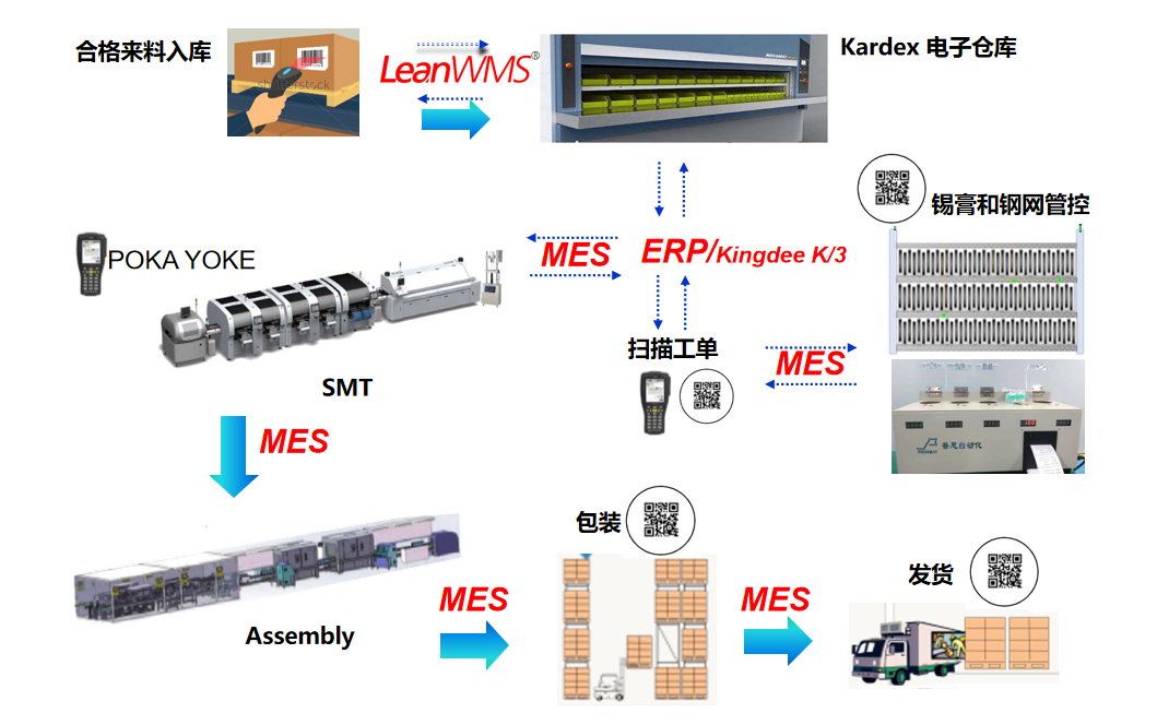 健科電子的制造管理系統(tǒng)由PLM,WMS,ERP,MES系統(tǒng)組成。WMS連接Kardex智能倉儲(chǔ)系統(tǒng),實(shí)現(xiàn)物料的先進(jìn)先出;ERP系統(tǒng)與PLM對(duì)接,將產(chǎn)品BOM導(dǎo)入ERP,實(shí)現(xiàn)物料的防錯(cuò)管理;MES系統(tǒng)實(shí)現(xiàn)整個(gè)生產(chǎn)過程的管控、記錄以及生產(chǎn)數(shù)據(jù)的分析。